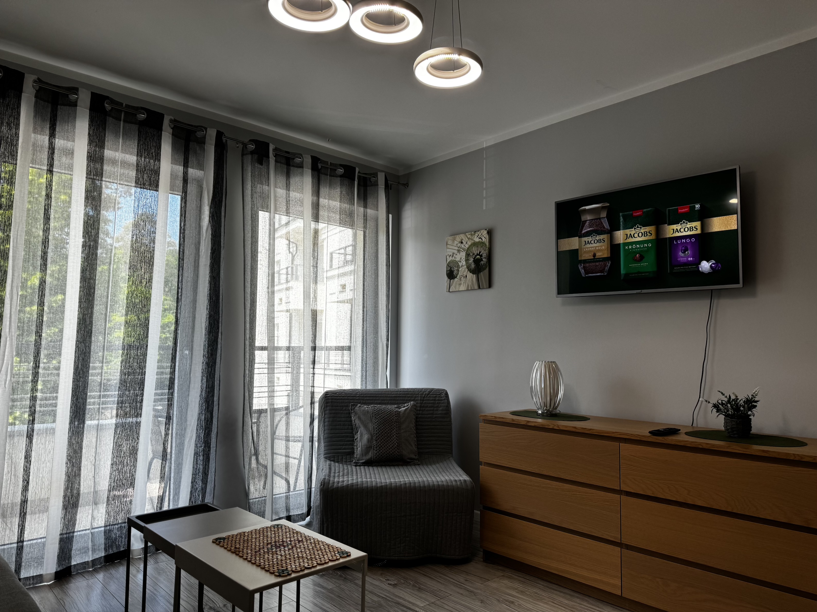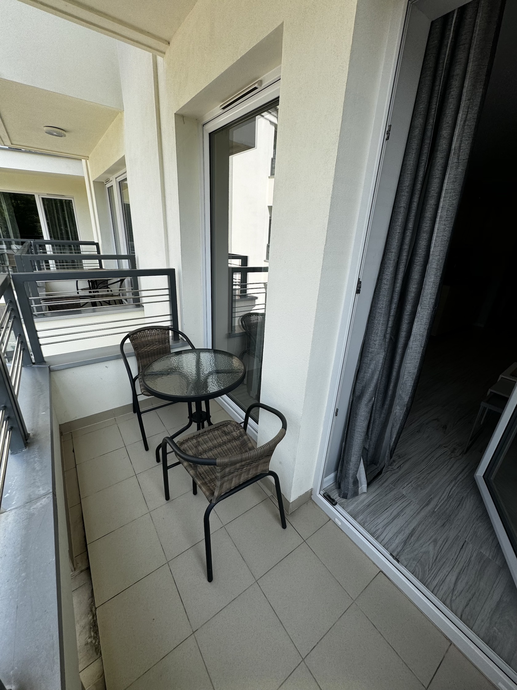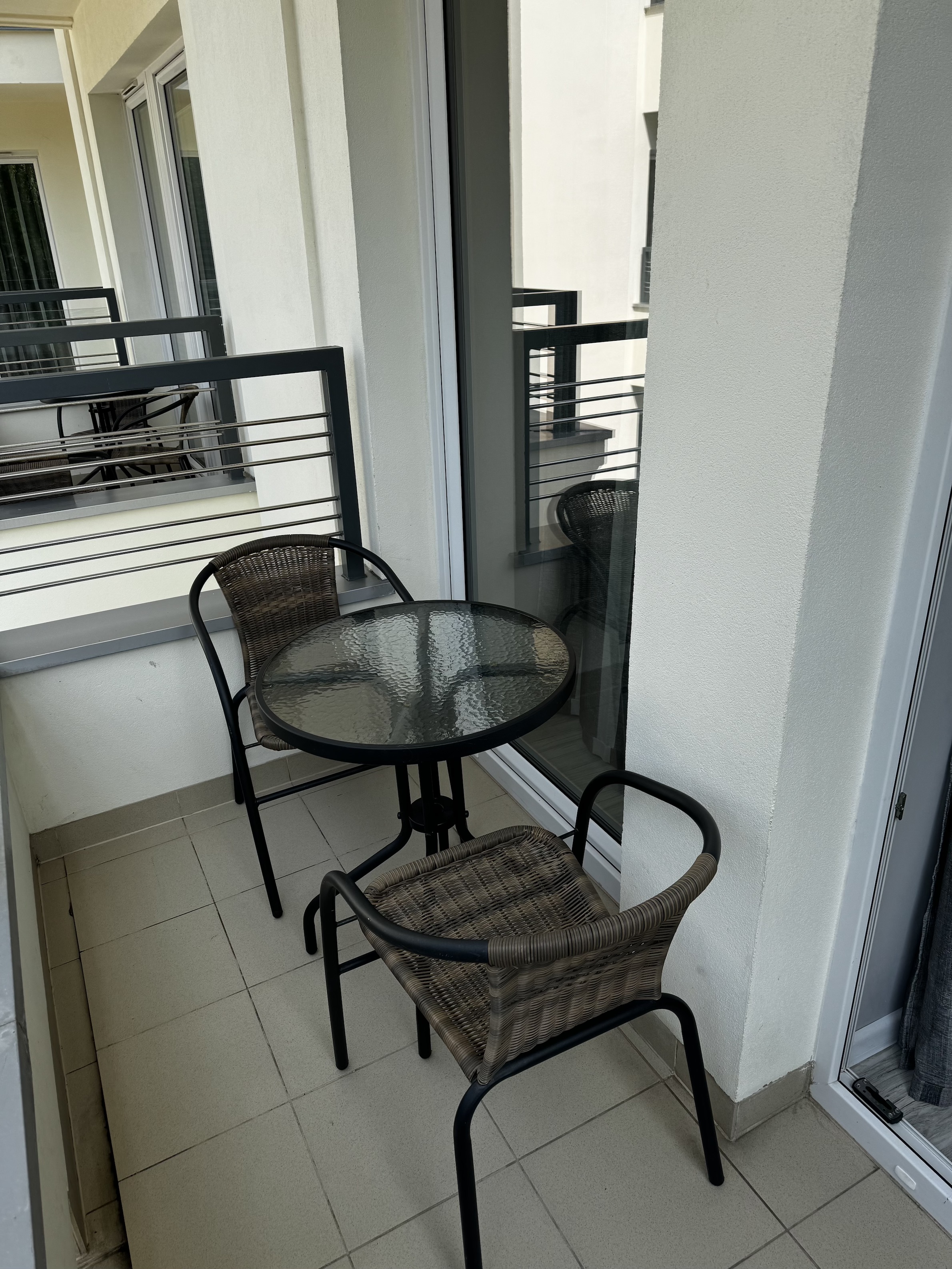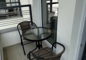 Mieszkanie składa się  z pokoju dziennego, z którego jest bezpośrednie wyjście na balkon o powierzchni ok. 4 m² ze stolikiem i dwoma krzesłami.