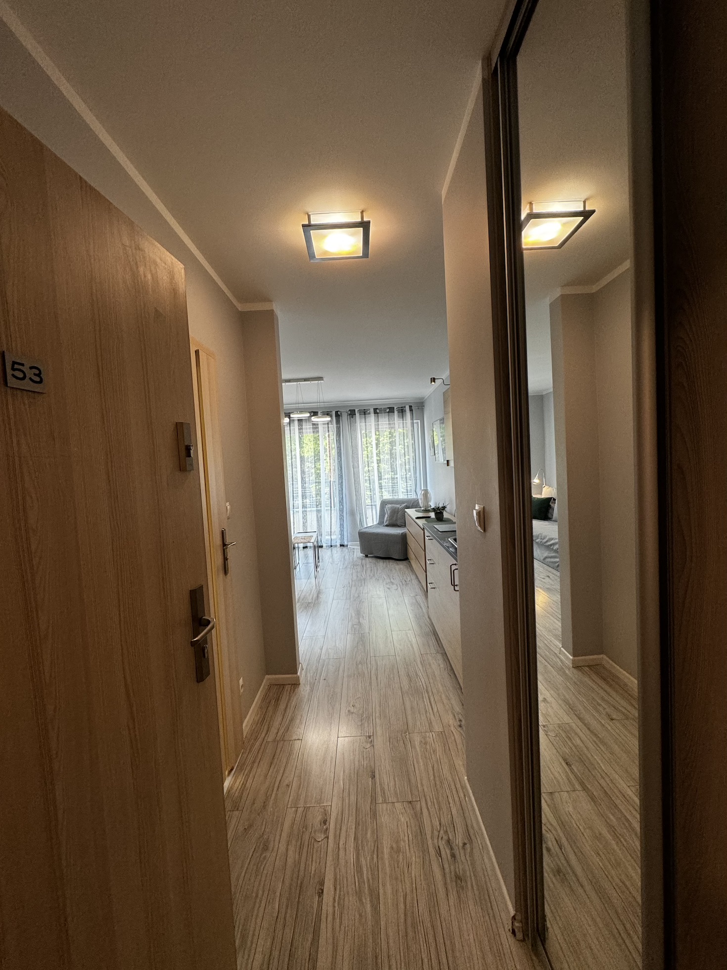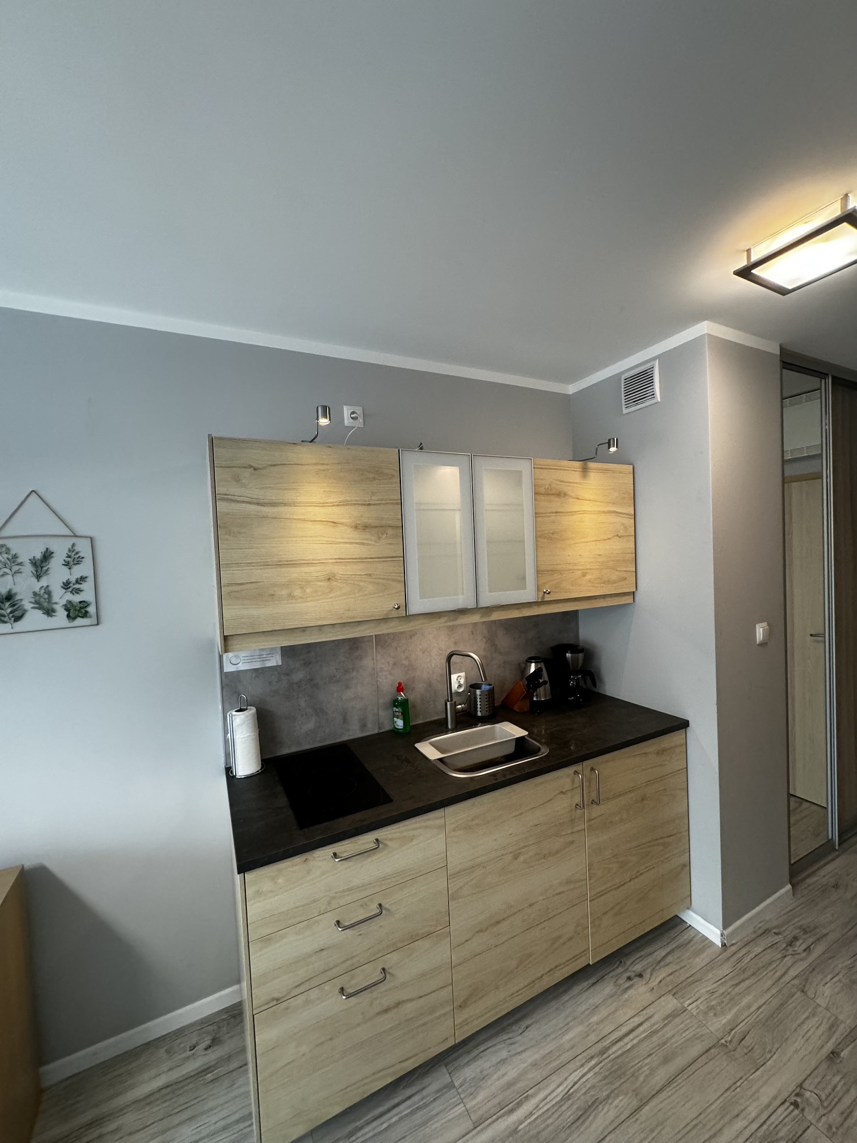 W korytarzu mamy szafę z lustrmem, żelazko z deską do prasowania, odkurzacz.