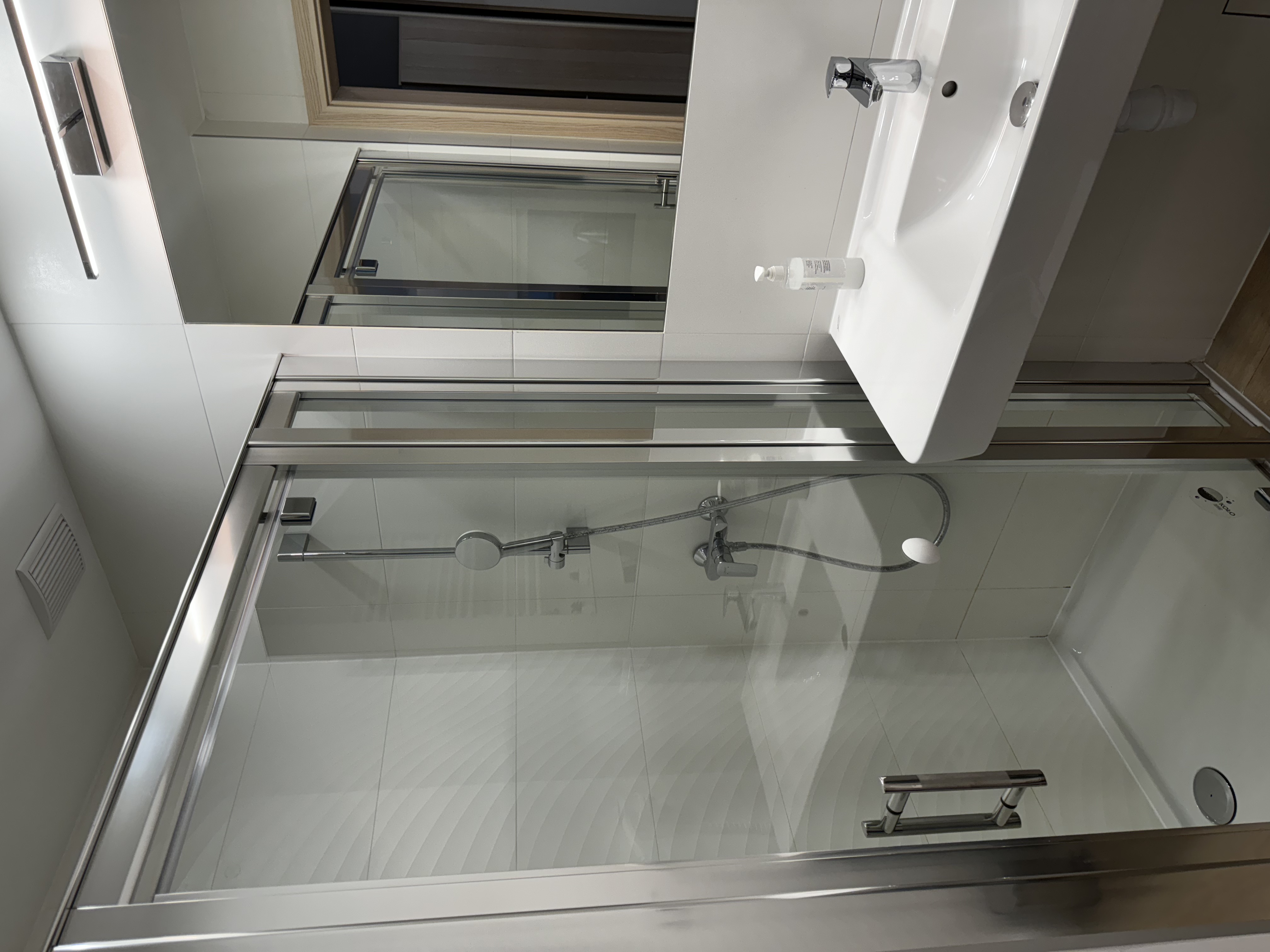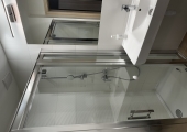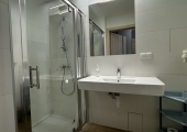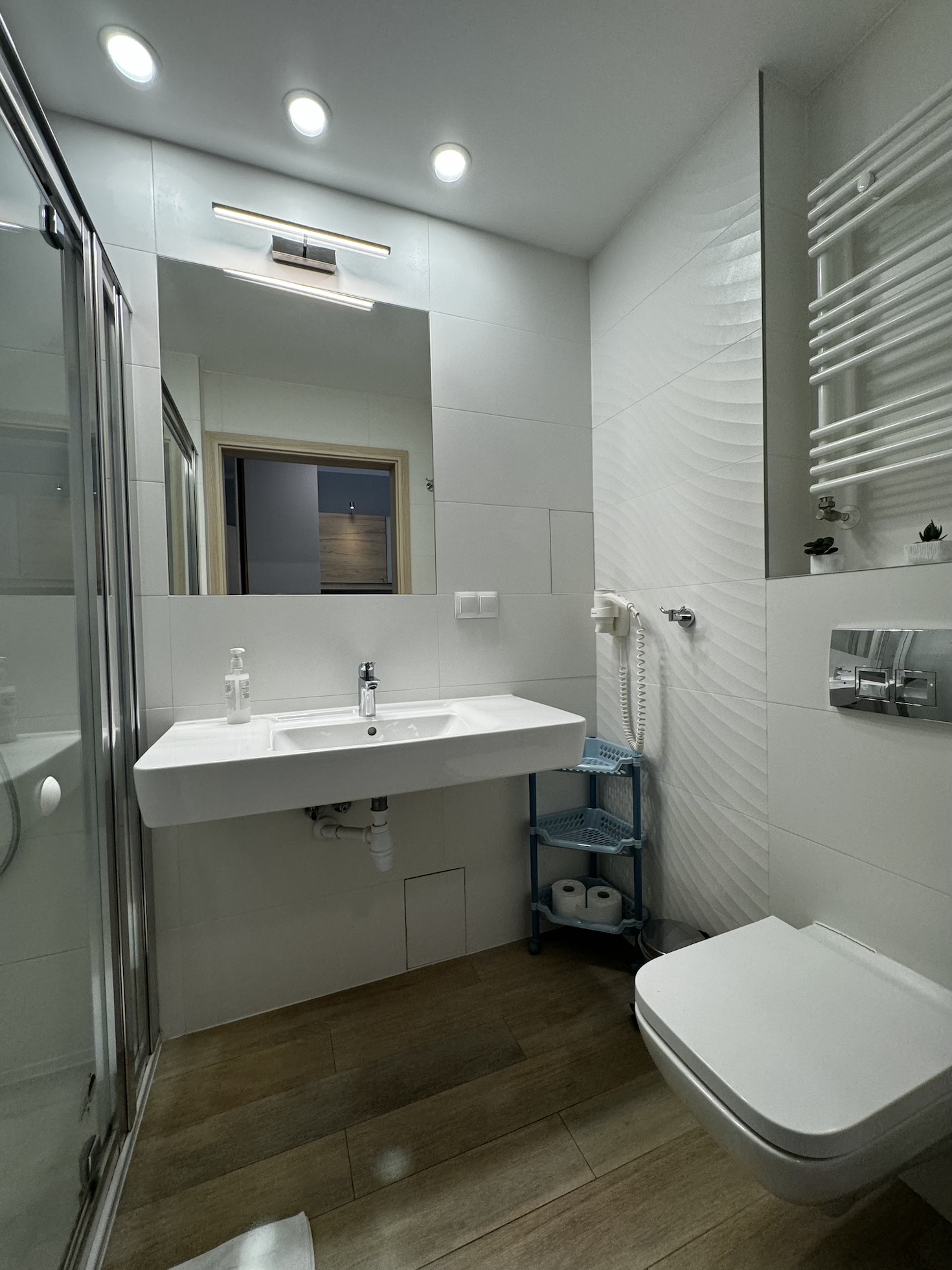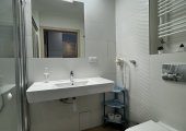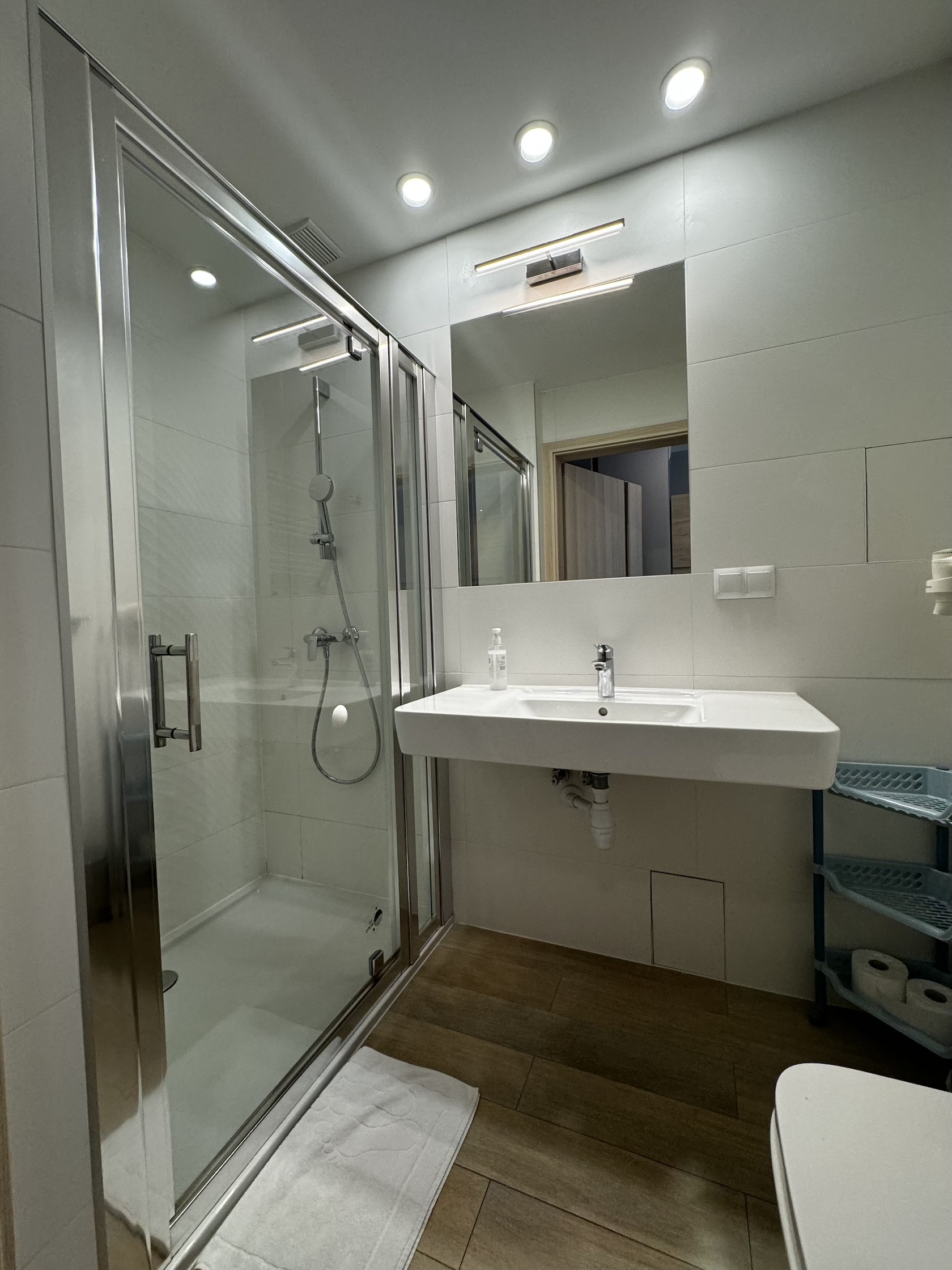 Łazienka ma dużą kabina prysznicową, umywalkę, duże lustro, suszarkę do włosów oraz WC.