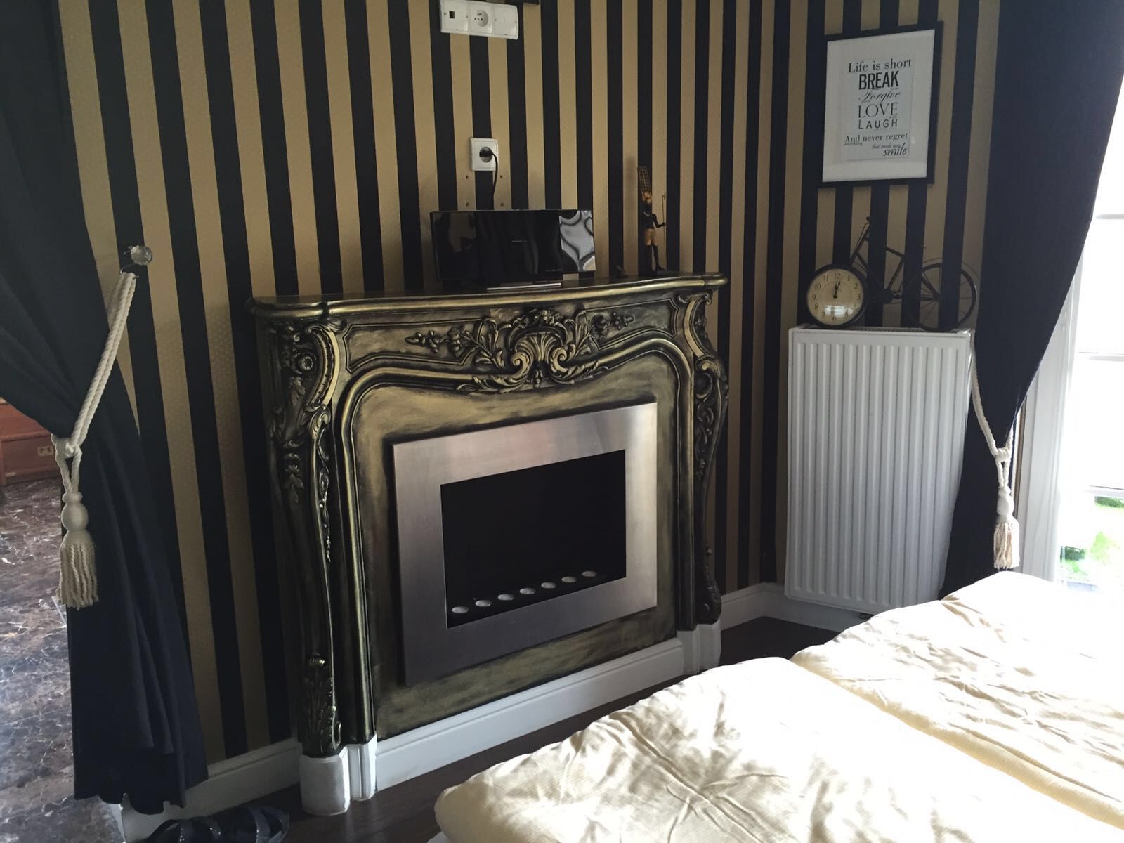 W sypialni na wyposażeniu jest typowe łóżko małżeńskie, duża szafa, bio kominek oraz akwarium.