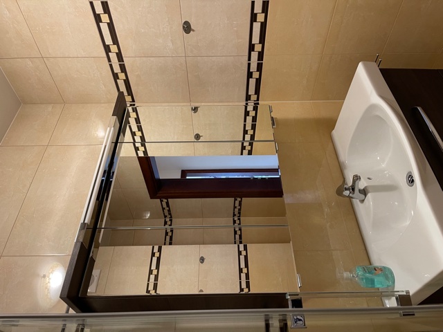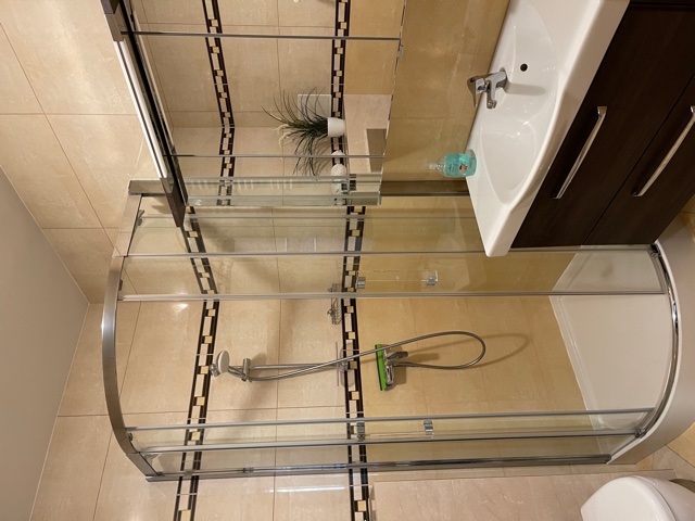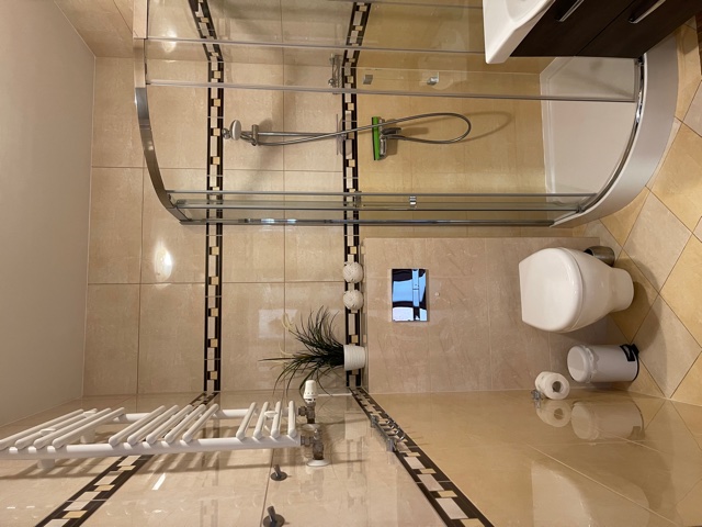 Łazienka jest duża, komfortowa z kabiną prysznicową, umywalką, lustrem i WC.